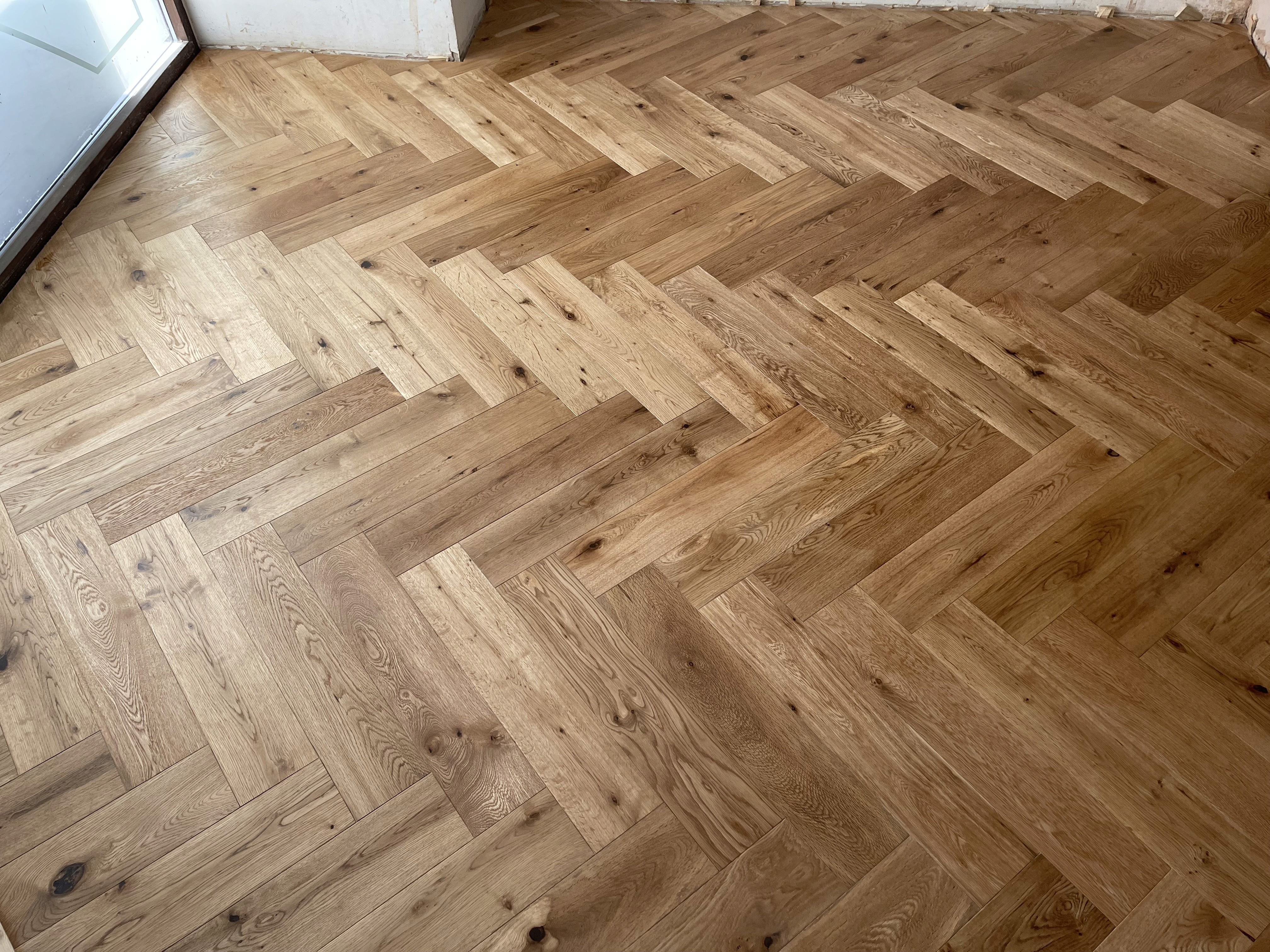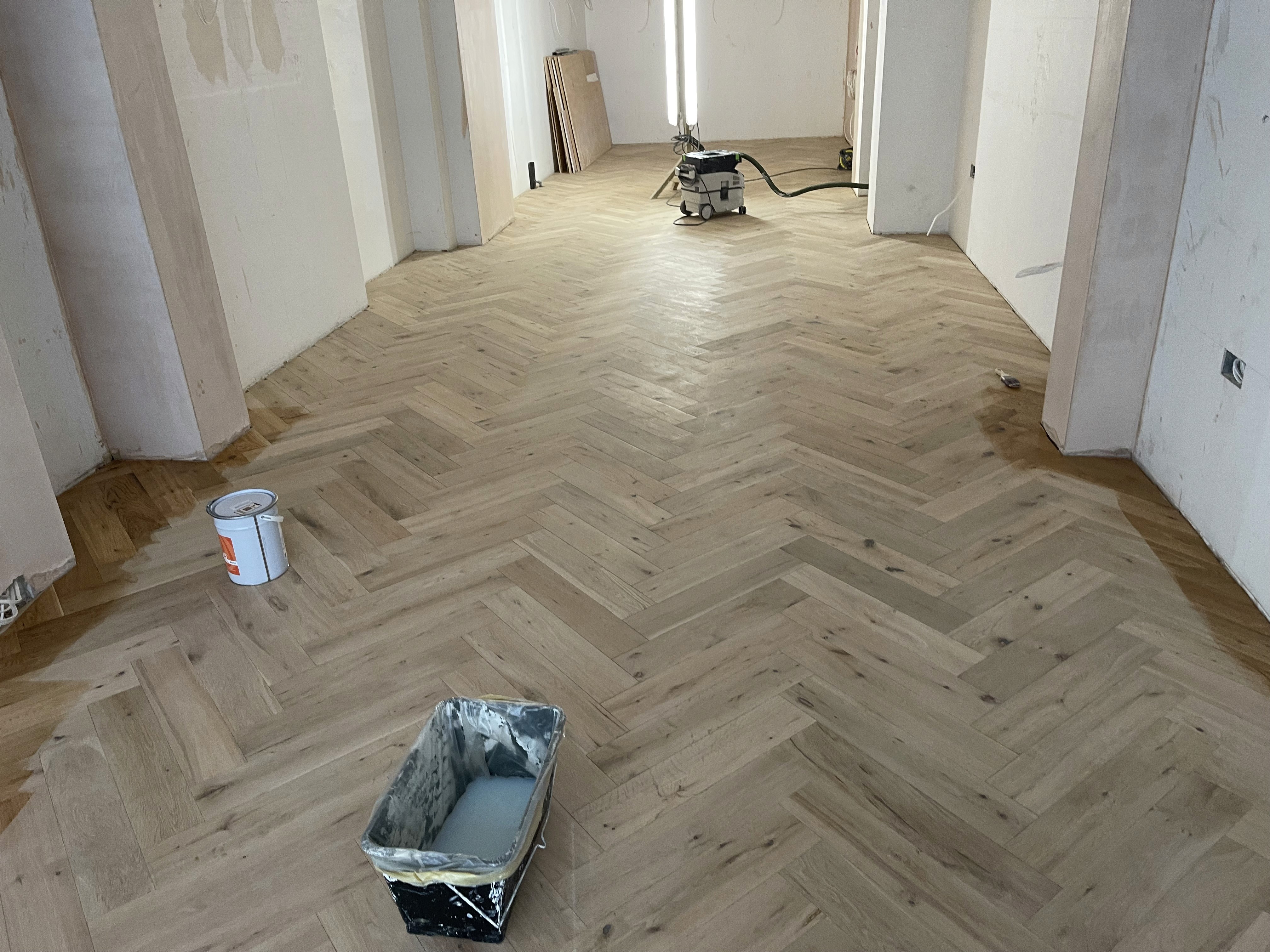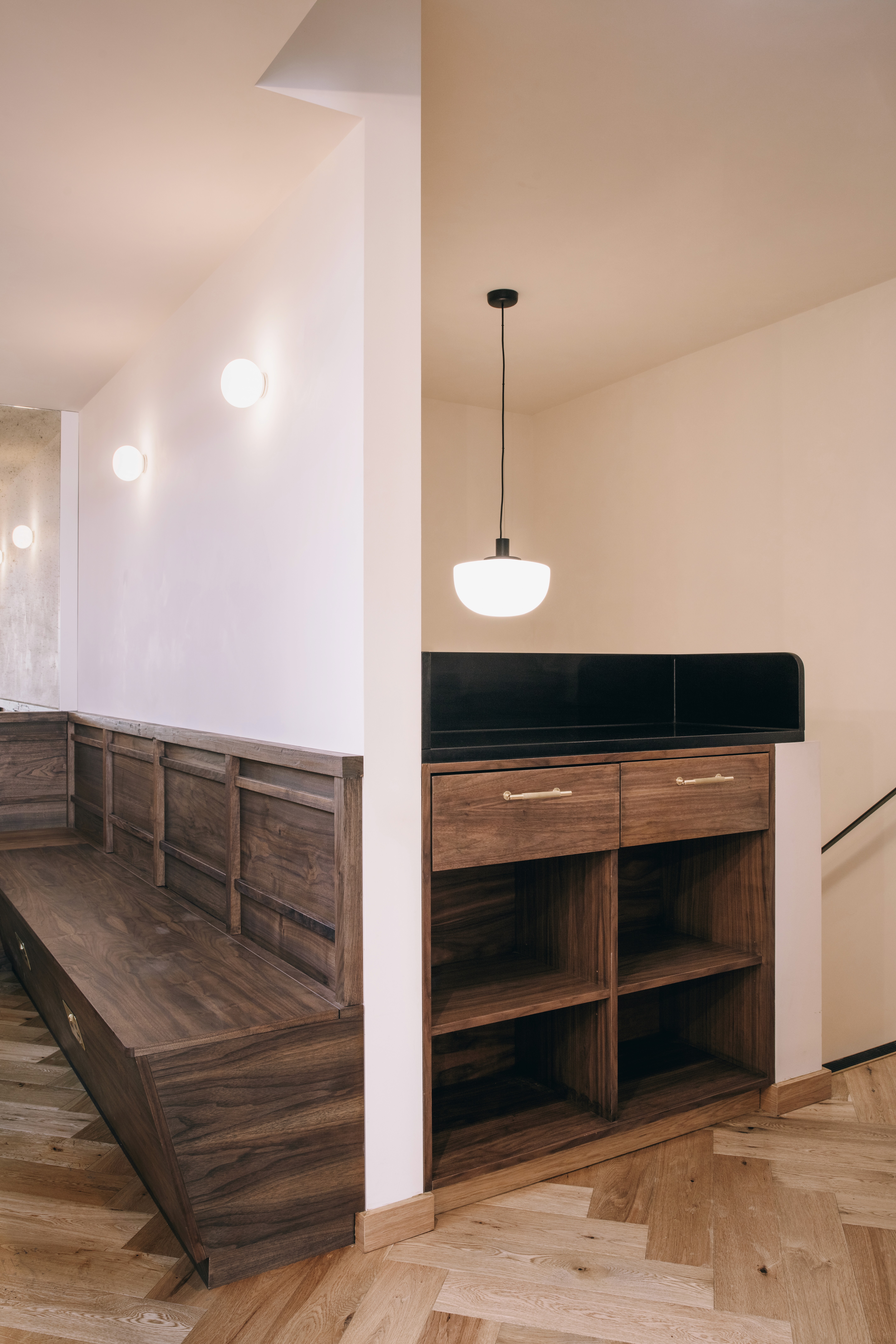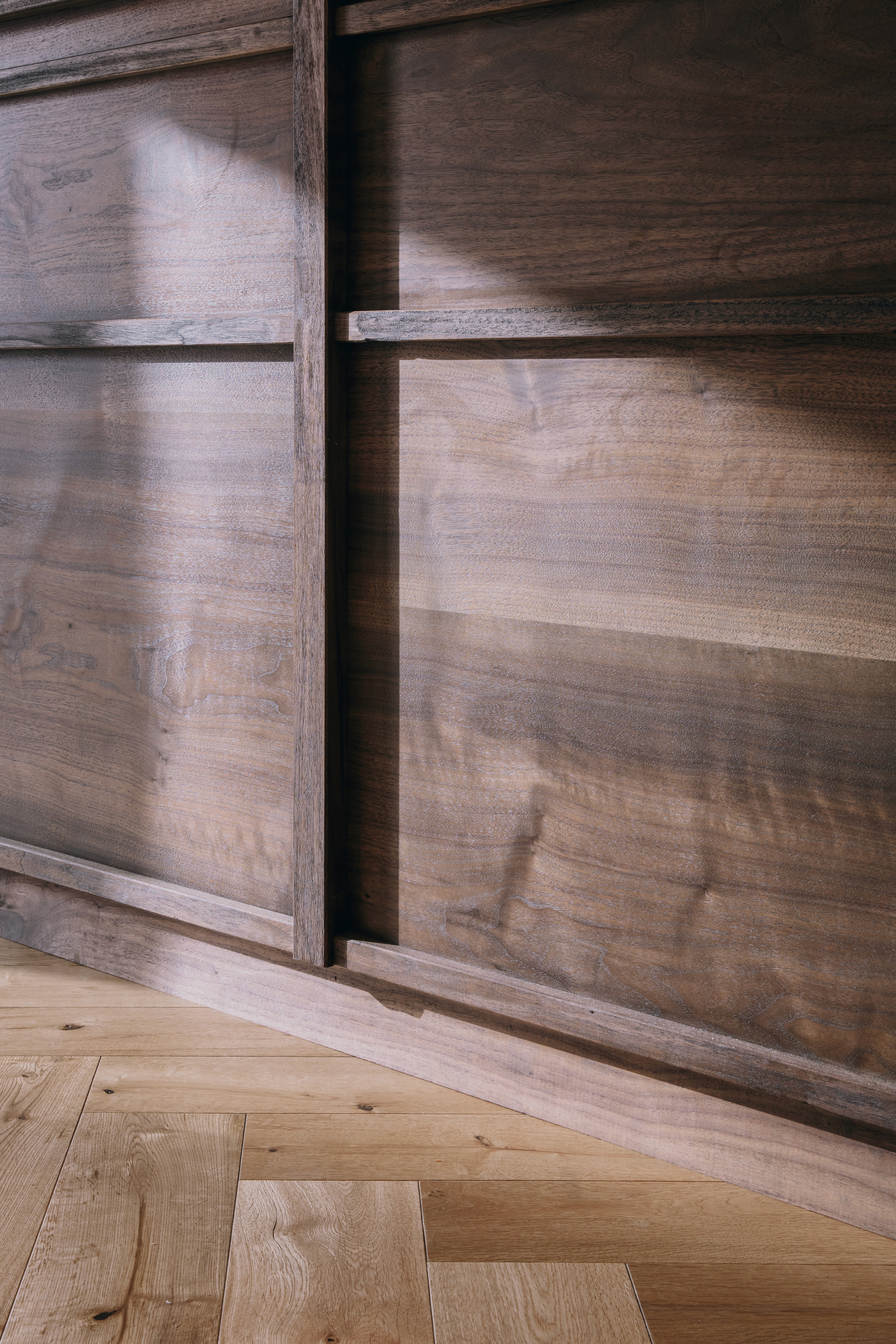 The project features custom-made walnut joinery throughout, including counters, shelving, and seating areas, all meticulously crafted to showcase the beauty of natural wood grain. The combination of soft, neutral wall tones and herringbone oak flooring enhances the airy, organic feel of the space.